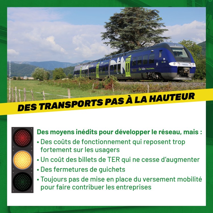 Si nous reconnaissons les moyens financiers importants dédiés au réseau des trains régionaux (TER), la réalité est plus sombre pour le portefeuille des habitant.es : le coût des billets TER ne cesse d’augmenter et des guichets ferment. Nous demandons la mise en œuvre du Versement Mobilité pour faire contribuer les entreprises au financement des transports, évitant ainsi de faire reposer tout le fonctionnement sur les seuls usager.e.s.