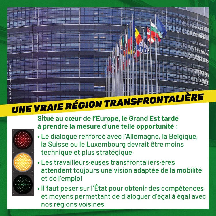 Situé au cœur de l’Europe, le Grand Est tarde à transformer l’essai. Le dialogue avec l’Allemagne, la Belgique, la Suisse ou le Luxembourg doit quitter le champ purement technique pour devenir stratégique. Il est urgent de peser sur l’État pour obtenir des compétences permettant de dialoguer d’égal à égal avec nos voisins, notamment sur la question cruciale de la mobilité des travailleurs frontaliers. Aussi, contre les déséquilibres durables avec le Luxembourg en particulier, nous soutenons la mise en place d’une compensation financière transfrontalière.
