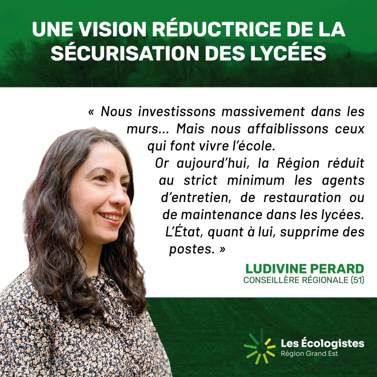 Ludivine Pérard a critiqué l’orientation du plan de sécurisation des lycées du Grand Est jugé trop centré sur des mesures matérielles (caméras, clôtures). Ces dispositifs ne résolvent pas les problèmes de fond mais ils déplacent les risques et créent une illusion de sécurité. La vraie prévention passe par le lien humain, l’écoute, et des moyens concrets : agents d’entretien, cantines, médecins scolaires alors que l’État et la Région réduisent ces effectifs, affaiblissant le rempart social contre la violence. La sécurité ne se décrète pas, elle se construit par l’accompagnement. Ludivine Pérard conclut : « Mieux vaut investir dans l’avenir que surveiller. »